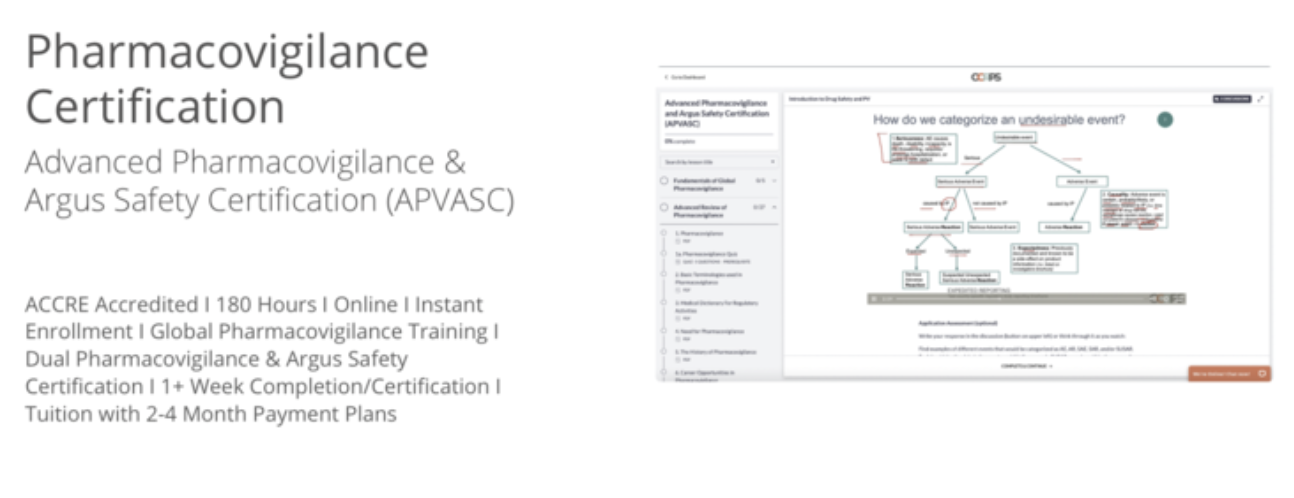 To increase your chances of getting hired or promoted, scroll below or enroll in our CCRPS Advanced Pharmacovigilance and Argus Safety Certification (APVASC)TM Course which covers drug safety and pharmacovigilance training